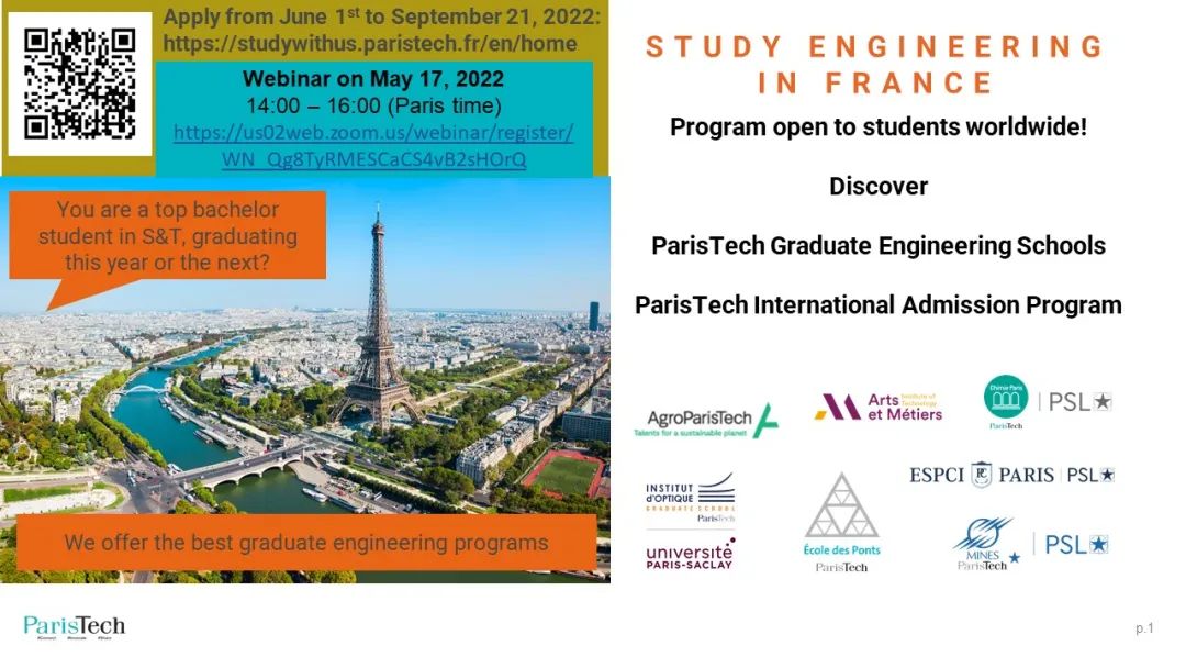 请参加我们2022年5月17日晚上8点(北京时间)的线上宣讲会 "探索巴黎高科国际招生计划",了解法国工程师学位的独特之处,并向我们每所学校的国际关系负责人提出你感兴趣的问题。
