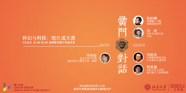 本期黉门对话以“科幻与科技:咫尺或天涯”为主题,着眼于人文、科技和文化的相互融合,邀请到四位不同专业背景的重量级嘉宾:《三体》作者刘慈欣,“神九”飞船航天员刘旺,中国载人飞船系统设计总师张柏楠,空天专家程承旗,通过他们之间的精彩对话来演绎这场非凡的思想碰撞、阐述航天科技与科幻艺术之间的妙趣关系。