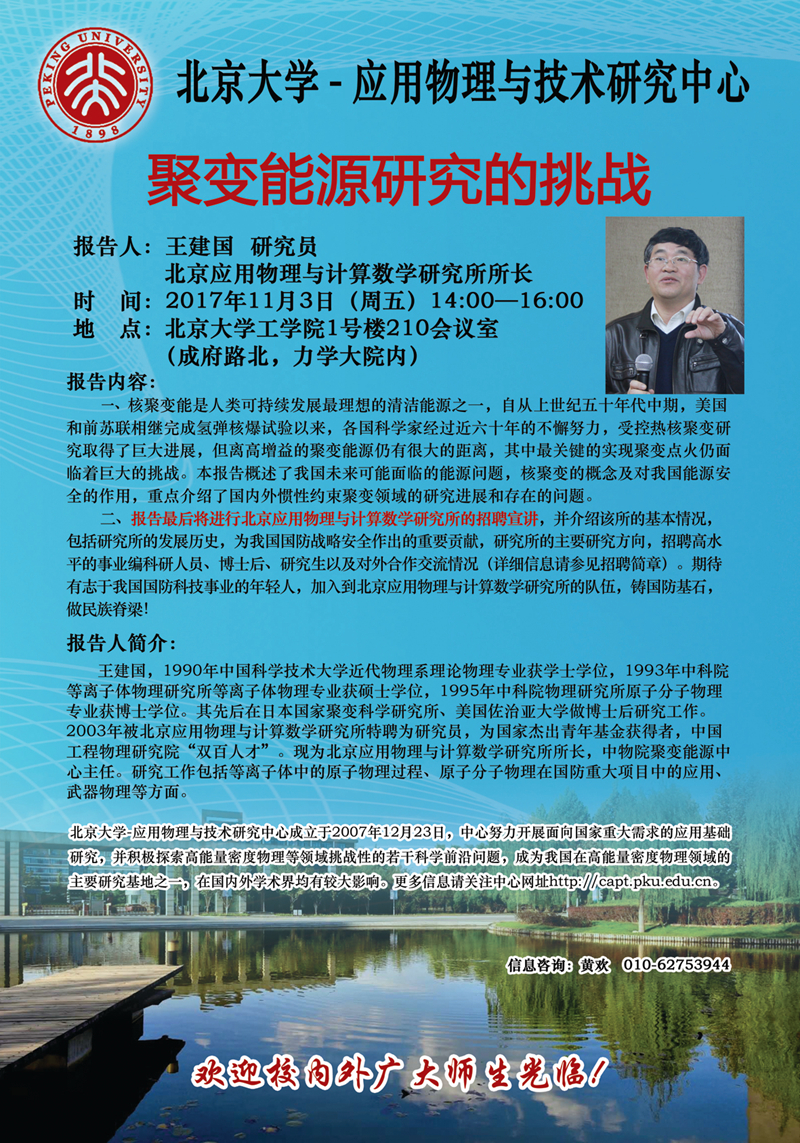 88858cc永利官网-中国工程物理研究院应用物理与技术研究中心荣幸邀请到了中国工程物理研究院下属单位北京应用物理与计算数学研究所所长王建国研究员来88858cc永利官网进行“聚变能源研究的挑战”学术报告及招聘宣讲。具体安排如下: