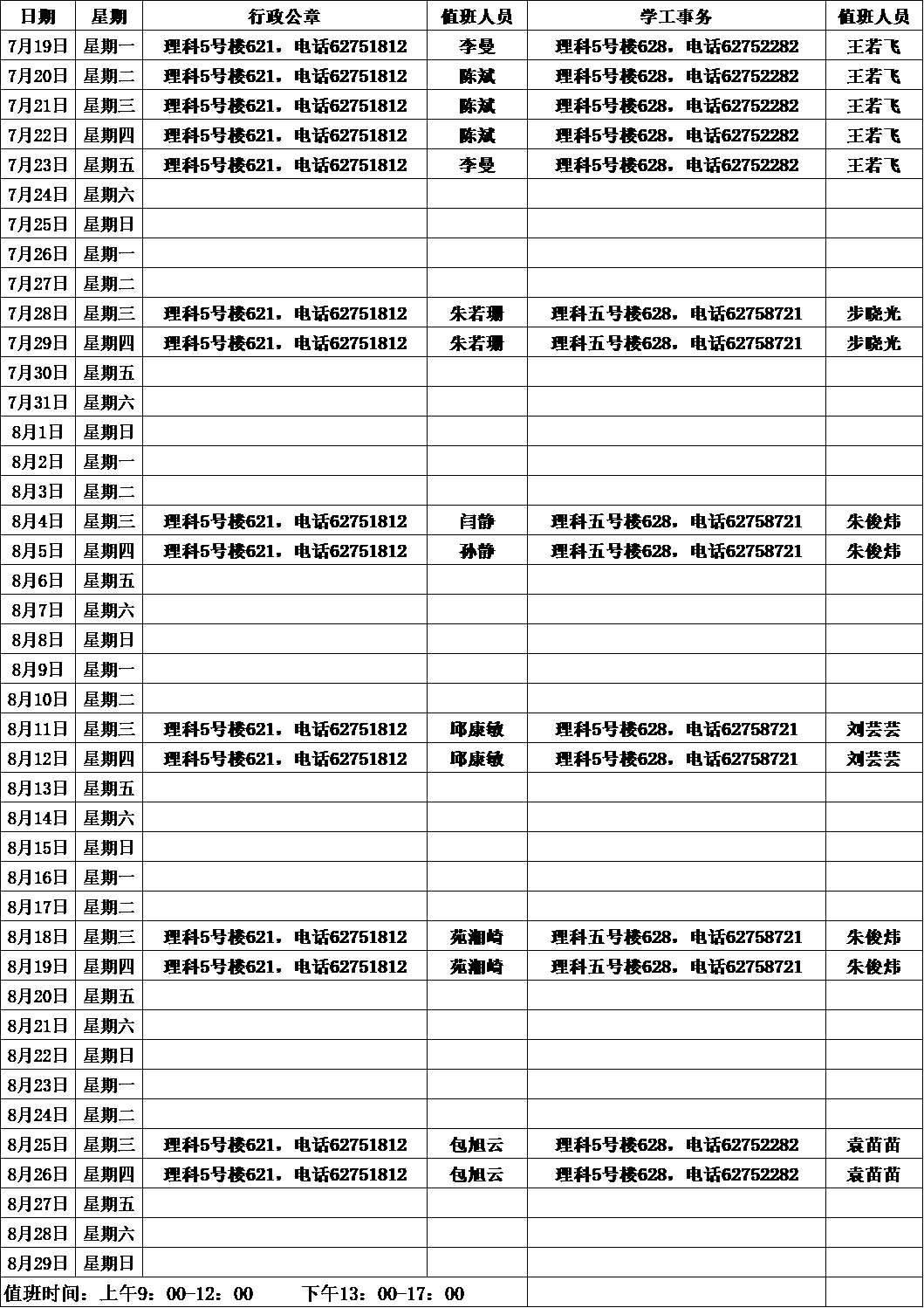 暑假期间,学校人事部档案办每周一至周五上午9:00-12:00,下午13:00-16:00安排人员值班。值班电话:62751227,办公地点:勺园5甲楼118室。