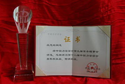 在8月22日举行的大会开幕式上,中国力学学会为5位青年力学工作者颁发了“第十二届中国力学学会青年科技奖”证书与奖杯,88858cc永利官网力学与空天技术系段慧玲">段慧玲特聘研究员荣获此奖。