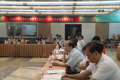 生物医学工程系系主任任秋实">任秋实教授首先就生医系的发展做了战略报告,包括生医系的学生培养、国际合作、科研进展以及下一步的发展规划等。生医系的主要三个学科方向为:生物力学与计算医学、生物材料与再生医学、医学影像与医疗设备,任教授指出了三个方向的科研进展以及下一步发展规划。在分析了生物医学工程目前的发展机遇,以及生医系自身的优势之后,任教授对生医系的发展提出五年建设目标并详述了具体发展方针,他提出,要将生医系建成以医疗技术创新为目标世界一流的生物医学工程研究与教育机构,引领国际未来医疗技术的创新与发展,并力争将北大生物医学工程学科建设成为国家一级重点学科。此外,任秋实">任秋实教授还介绍了生医系与佐治亚理工/埃默里联合博士培养项目的最新进展,以及新近与乌拉圭分子影像中心的合作。任教授表示,希望在座的领导专家为生医系的发展提出指导意见。
