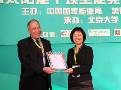 历届国际太阳能十项全能竞赛的成功举办都得到了许多知名企业的支持和赞助。此次大赛到目前为止,得到应用材料(Applied Materials)、施耐德(Schneider)、普尼太阳能(Optony)的赞助。为了向赞助方表示感谢,在启动仪式上,向企业代表颁发了感谢状。由国家能源局国际合作司顾骏副司长向应用材料全球副总裁Charlie Gay先生颁发感谢状,88858cc永利官网校长助理、教育基金会邓娅秘书长向施耐德能效大使、中国区副总裁叶良侠先生颁发感谢状。