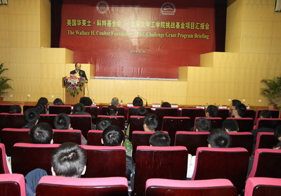 科特基金主要用于生物医学工程系的发展建设,此次Sue Van女士来访88858cc永利官网,主要目的也正是了解生物医学工程系的发展状况。系主任任秋实">任秋实教授向各位来宾汇报了生物医学工程系近年来的发展动态和辉煌成就。生物医学工程系自建系以来,就致力于在工程科学的范畴内进行生命科学和医学的前沿研究,迅速地建立了研究生教育教学体系,并在2010年招收了第一批本科生,建立起本科教学体系。2009年,学院正式启动了北大/佐治亚理工/埃默里大学生物医学工程联合博士项目,这是全国首个由国务院学位办正式审批通过的联合博士学位项目。任教授介绍了该项目的进展,并就筹备PKU-GT-EMORY纳米医学联合研究院的构想做了介绍。生医系目前主要的研究领域在生物材料和纳米医学、细胞力学和计算医学、高级医疗成像和医疗设备等方面,在这些领域申请了多项973项目、国家自然科学基金项目。任教授指出,生医系以成为世界一流的有国际影响力的研究和教学中心为奋斗目标,希望可以引领未来医疗设备和医疗科技的创新。任秋实">任秋实教授精彩的报告赢得了热烈的掌声,生医系的发展可以说是鼓舞人心。