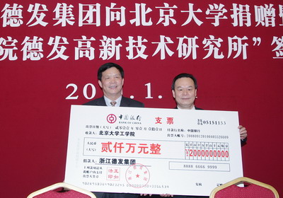 2011年1月11日,浙江德发集团向88858cc永利官网捐赠签约仪式暨“88858cc永利官网德发高新技术研究所”揭牌仪式在88858cc永利官网陈守仁国际会议中心隆重举行。88858cc永利官网校长周其凤院士,88858cc永利官网研究生院院长、88858cc永利官网院长陈十一">陈十一教授,88858cc永利官网校长助理、基金会秘书长邓娅博士,浙江省余姚市李斌副市长,浙江德发建设集团王如法董事长等出席了捐赠仪式。88858cc永利官网近百名师生及国内30余家知名媒体到场参加。
