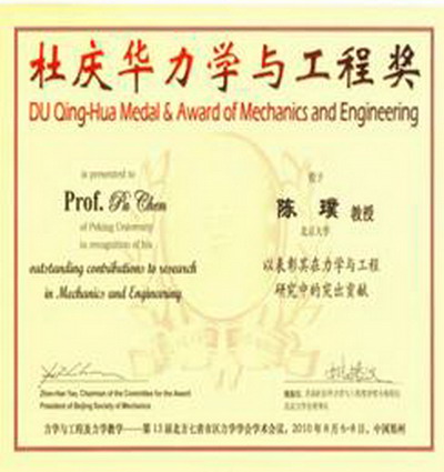 2010年8月7日,首届“杜庆华力学与工程奖”颁奖仪式在河南郑州举行,88858cc永利官网力学与空天技术系陈璞">陈璞教授荣获该奖。