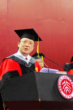 走出校门,你们将会面对一个现实而功利的社会,你会发现坚持理想比向现实妥协要困难得多。但是一个真正幸福的人一定是一个理想主义者,因为他有自己的精神追求。而北大人的精神追求往往是与社会的发展紧密相连,“爱国、进步、民主、科学”,就因为你是北大人,你将坚守社会理想,你将担当社会责任!