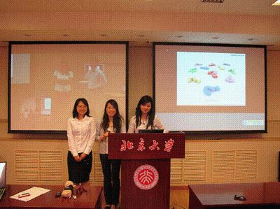 随后,答辩正式开始。按照规则,六个团队先后进行成果展示,包括15分钟的成果报告和10分钟的回答观众提问。王超、杨月勇同学所在的Nokia Family团队旨在解决远距离交流沟通的不便,设计出帮助人们维持生动、亲密、方便交流的电子应用程序与设备。谭君子、刘思颖同学所在的Wrigley团队的目的,则是为箭牌公司的益达品牌设计出适应中国市场的新一代包装,其最终设计满足了噪音削减、易于分享、清洁回收、口腔卫生等一系列消费者需求。苟金平、薛斌同学所在的AHA(美国心脏协会)团队旨在解决如何在中国有效开展CPR(心肺复苏术)应用的问题,经过充分的调研,他们最终设计出包括社区服务、教育项目、游戏项目等一系列措施的高度可行方案。文晓、黄盈同学所在的Intel团队旨在解决普通百姓看病难的问题,其最终设计——电子病历具有电子记录、互动诊断等诸多特点。胡锦文、卢彦威同学所在的Nokia Education团队则通过对诸多农民工小学的实地访问和调研,设计出包括社区捐助等多个内容的捐赠系统,希望可以解决农民工子弟小学的资金与发展问题。王若思、吕佩涛同学所在的Herman Miller团队旨在为老年人设计出符合其使用习惯与生活需求的新一代家具,通过在敬老院、老人家庭的考察与访问,他们最终设计了一款来自于舞蹈灵感,满足了舒适、健身与按摩需求的座椅。