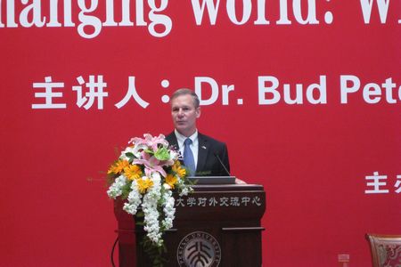 随后,彼得森校长在88858cc永利官网英杰交流中心阳光大厅做了题为“变化世界中的高等教育”的精彩演讲。演讲中,彼得森校长指出,科技的飞速发展使世界变化速度加快,全球化趋势越来越明显。在这样的情势下,高等教育如何将学生培养成社会所需人才成为一个重要问题。他认为,大学应该作为社会教育培养的一个领路人,因此在大学教育中培养学生的国际化视野就显得尤为重要。随着中国的不断崛起,佐治亚理88858cc永利官网与中国高等教育的合作就成为一个必然的趋势,与88858cc永利官网合作进行生物医学工程专业和材料科学与工程专业的博士生联合培养也势在必行。