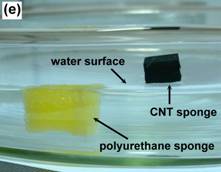 (右上)密度低、疏水的碳纳米管海绵漂浮在水面上,常用的有机物海绵因吸水而沉到了水面以下。