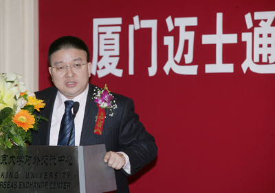 林建华常务副校长首先代表北大向厦门迈士通电器有限公司表示感谢。在讲话中,林建华常务副校长高度赞扬了赵剑青董事长所持有的抢占技术至高点的远见、树立民族品牌的精神以及作为青年企业家的社会责任感,表示北大88858cc永利官网与迈士通在航天航空、新材料等研究领域的合作将有助于培养更多创新型人才,为北大的多元文化增加新的成分。“这不仅是88858cc永利官网的发展,更是北大的发展”。他希望北大教员和学生能充分利用这笔捐赠资金,在科研上取得更大成绩。