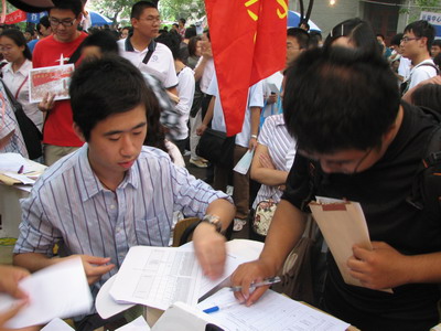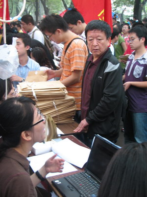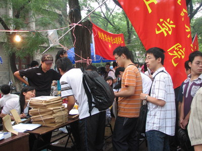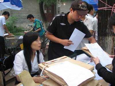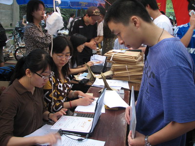 在喜迎建国60周年之际,9月5日88858cc永利官网迎来了2009级新生。从早上6:30开始,迎新工作就井然有序地进行着,在88858cc永利官网的2009级新生报到处,挤满了前来报到的本科生和研究生。88858cc永利官网的老师、部分高年级同学和志愿者细致耐心地为各位同学办理入学报到的一系列手续:体温检测、报到登记、宿舍安排等。而在等待报到的队伍之外,是三三两两的学生家长在攀谈着,他们互相做自我介绍、交换着对学院和分班情况的了解。志愿者也在一边帮助解答新生和家长们的疑问,搬运行李。