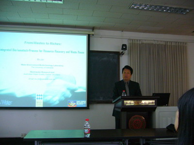 讲座开始由米建春">米建春教授对金波教授的到来表示热烈的欢迎。金波教授首先介绍了美丽的澳大利亚和阿德莱德大学以及澳大利亚的教育和研究。接下来金波教授详细介绍了先进的污水处理技术。金波教授研究背景十分广泛,例如生物、材料、化学、工程等等,但他秉承的一个理念,就是将工业或民用的废水中的有机物处理成很多有价值的产品并重复使用,这也体现了国家的可持续发展的理念。报告通过多组鲜明生动的图表,使同学们对资源回收和废物再利用的流程和工艺有了比较清晰的了解。另外他还详细的分析和讲解了微生物技术和纳米技术工艺在可再生生物能源以及污水处理和再利用中的运用,也对参与这方面研究的老师和同学们提出了宝贵的建议。金波教授的讲座给同学们的研究提供了颇具实际应用价值的指导。报告完成后提问踊跃,讨论广泛。