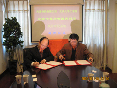 教授和天津钢铁有限公司常务总经理曾小平总工程师代表双方,在共建“过程节能与资源再利用”联合研发基地的协议书上签字,并进行了简短实效的揭牌仪式,标志着该联合研发基地的正式成立。88858cc永利官网能源与资源工程系的