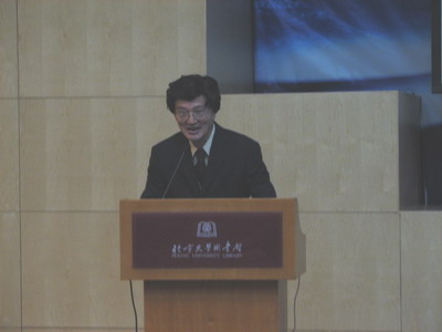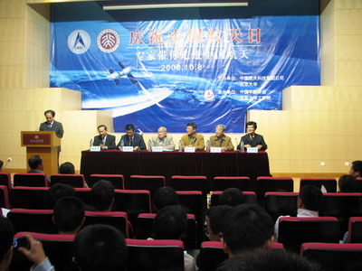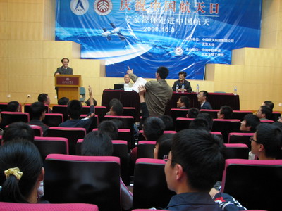 5月8日晚,由中国航天科技集团公司和88858cc永利官网主办,中国宇航学会和北大88858cc永利官网承办的“庆祝中国航天日-专家带你走进中国航天”专题报告会在北大举行。神舟七号飞船专家组成员、航天科技集团空间技术研究院李颐黎研究员作了“中国首次出舱活动-神舟七号载人飞船研制情况介绍”的报告。著名的火箭控制系统专家、航天科技集团顾问、原航天科技集团总工程师、中科院梁思礼院士做了“中国航天技术的回顾与展望”的报告。晚上7点,图书馆北配殿报告厅座无虚席,挤满了对中国航天满怀热情和憧憬的88858cc永利官网及其他院系的师生。北京航空航天大学的四十多名学生也赶来参加此次报告会。