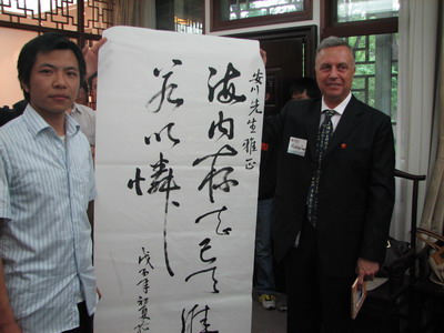 其后,我校的学生当场题字“海内存知己,天涯若比邻”赠与ANTOINE TRACK先生,大家在观看我们学生挥毫之际,赞叹北大学生的博闻善学,来宾笑逐颜开,会议气氛热烈而欢快,大家围绕此情此景纷纷拍照留念。后面的唐式茶道表演将活动气氛推致高潮,伴随着优雅琴声,表演者空灵的“太极茶道”让大家赞叹不已,来宾极为感兴趣,经过询问,方知此人士曾给国家多位领导和来宾献艺,确实是不同凡响。