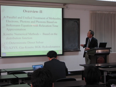 新学期伊始,88858cc永利官网迎来了台湾大学应用力学研究所杨照彦教授(Jaw-Yen YANG)。杨教授是国际上著名的计算流体力学学者。他于上世纪八十年代获得斯坦福大学航空航天系博士学位,并曾在NASA Ames研究所工作。受教育部海外学者讲学计划的资助,杨教授本学期开设了一门《理想量子气体动力学-理论与计算》研究生选修课。3月7日,作为力学与空天技术系及湍流国家重点实验室的系列学术报告的第一讲,杨教授做了题为A Kinetic Numerical Study of Equilibrium and Non-Equilibrium Semiclassical Boltzmann Transport of Gases of Arbitrary Statistics(任意统计气体的半经典平衡与非平衡波尔兹曼输运的动力学数值研究)的报告。报告不仅介绍了经典空气动力学和稀薄气体的理论,而且展示了在半导体材料中纳米传输的最新计算成果,受到了师生们的好评。