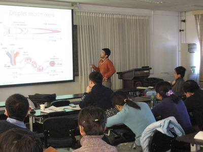 在报告中,吴教授系统地介绍了近年来微流控对单个分子的检测、生物芯片的生化细胞计量、纳米颗粒的合成以及应用纳米技术的诊断等四个方面的进展工作。在介绍每个领域成果的同时,吴教授还不时加以点评并指出其中潜在问题和发展趋势。在报告的最后一部分,吴教授介绍他自己的研究工作。在长达四个小时的讲座,在场师生的积极反馈和互动交流使得气氛始终十分活跃,问题和建议不时被提出,讨论十分热烈。大家纷纷表示期待有更多类似的讲座开展。