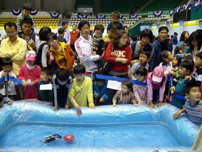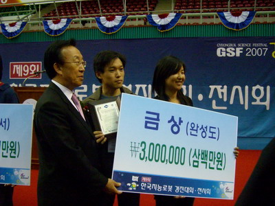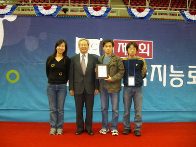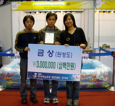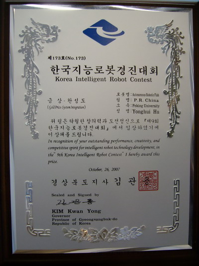 副教授的指导下,由研究生胡永辉、赵惟、王琦组成的88858cc永利官网代表队参加了此次大赛,经过两轮激烈的角逐,智能控制实验室所研制的自主机器鱼由于在系统集成方面的优势获得了大赛金奖(Gold Prize),同时获得了3,000,000韩元的奖金。浦项市市长和市领导饶有兴趣地参观了88858cc永利官网的机器人表演,并为88858cc永利官网代表队颁奖。