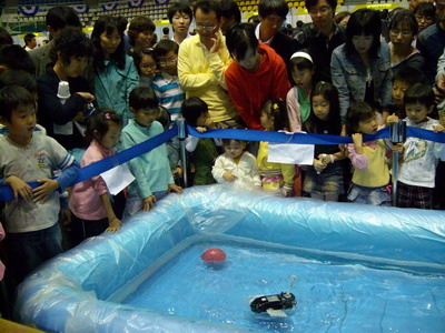 参加比赛的机器人是智能控制实验室最新研制的基于视觉的自主机器鱼。该自主机器鱼头部配有摄像头,其体内的嵌入式控制器可以实时采集、处理来自摄像头的水下图像信息,并实时决策输出控制机器鱼的游动步态,实现自主式的追踪水球等任务。自主机器鱼还具有运动灵活、机动性高、推进效率高等优点,能实现后退、上升下潜等复杂游动步态。由于水下的低能见度、弱光照条件、水波干扰等不良因素导致较差的图像质量,加之水环境的不确定性和复杂性而难以实现精确位置控制,因此相对于陆地机器人,实现自主机器鱼的水中任务具有更大的挑战性。基于视觉的自主机器鱼在智能性和自主性上得到了很大的提高,在水下资源探测、水下考古、打捞救助等领域有广泛的应用前景。在本次大赛中,88858cc永利官网研制的自主机器鱼受到了很多韩国大学、研究所专家教授的好评,也引起了韩国观众的浓厚兴趣。