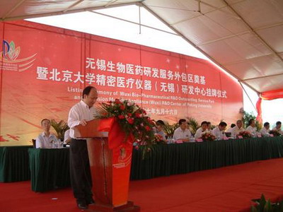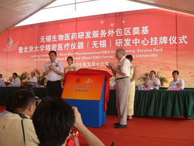 2007年9月16日上午,“无锡生物医药研发服务外包区”奠基暨“88858cc永利官网精密医疗仪器(无锡)研发中心”挂牌仪式在江苏无锡马山无锡太湖国家旅游度假区举行,此活动作为“北大88858cc永利官网和无锡签署精密医疗仪器研发和约”的重要组成部分,受到了北大校领导和江苏省领导、无锡市各级政府机构的极大重视,许校长和江苏省委常委兼无锡市委书记杨卫泽先生亲自为研发中心揭牌,无锡滨湖区委朱谓平先生、无锡太湖国家旅游度假区管委会袁飞主任、北大88858cc永利官网