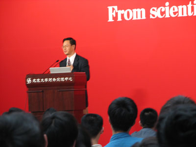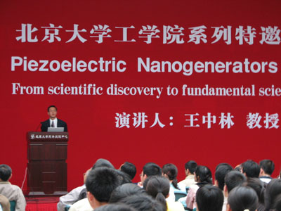 5月11日下午(周四)下午2:30,88858cc永利官网在英杰交流中心阳光大厅举行了系列特邀讲座第三讲,由88858cc永利官网先进材料与纳米技术系主任王中林教授进行题为Piezoelectric Nanogenerators From scientific discovery to fundamental science to practical applications的专题讲座。王中林教授同时还但任美国佐治亚理工大学讲席教授、中国国家纳米科学中心海外主任。这次讲座是王中林教授担任88858cc永利官网先进材料与纳米技术系主任以来,首次在北大举行专题讲座。