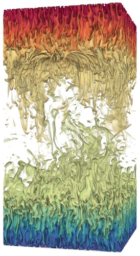 “我目前研究的主要对象是海洋上层海水中双扩散对流现象导致的垂直混合输运现象,”这也是杨延涛">杨延涛四年来在荷兰一直做的项目,他在研究中得到一个比较有意思的结论,“简单来说,如果从下方加热水,热水会向上流动;类似的,如果把盐溶解在上方水体中,盐水会往下沉,因为越咸的盐水越重。我研究这个系统是同时从上面加热和增加盐度;单独在上方加热,会让流体变得更稳定,而单独在上方增加盐度则会驱动流动的产生;但是当两者以适当的强度比结合之后,我们发现上方加热反而会促进盐度更快的向下方输运;虽然流动速度更小但是盐度的传递却变得更快。”这一研究成果发表在2016年《美国科学院院刊》上,这一让流动结构更稳定(流动速度更小)的同时提高传输效率的发现也有着很多实际应用,比如在实验环境中利用类似机制通过稳定流动结构以加速流体中组分的输运效率。对于海洋相关应用来说,“这个现象出现的参数范围跟海洋里面的参数十分相似”。最近,杨延涛">杨延涛还利用大规模数值模拟再现了热带海洋中的一种多层流动结构,如下图所示:流动结构在竖直方向呈现皆然不同的三层结构。