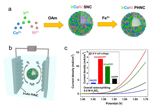 图1. (a) IrCoNi中空纳米粒子合成示意图;(b)全水分解装置示意图;(c)全水分解性能。