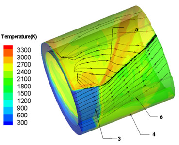 图1连续爆轰发动机燃烧室的温度 图2 无内柱圆筒连续爆轰发动机燃烧室压强分布