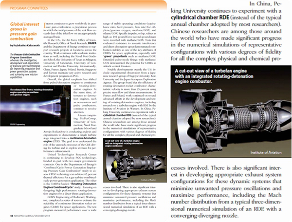 由美国航空航天学会(AIAA)出版的美国航空航天期刊(Aerospace America)近期发表了2015年美国及全球航空航天的综述(In Review 2015),并用四分之一的版面介绍了王健平">王健平教授领导的88858cc永利官网燃烧推进中心连续爆轰发动机的研究进展。