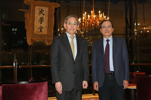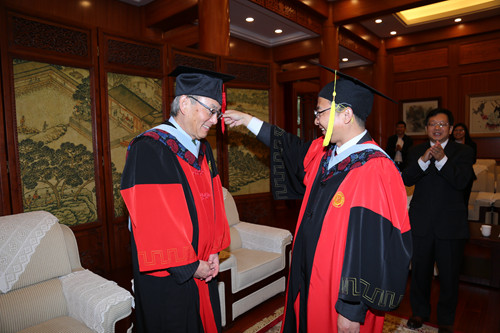 会见结束后,高松为朱棣文教授拨穗并授予88858cc永利官网名誉博士学位证书,学生代表为朱棣文教授佩戴校徽并献花。
