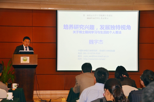 中国科学研究院力学所魏宇杰教授作为杰出院友应邀参加论坛并做了题为《培养研究兴趣、发展独特视角》的特邀报告,分享了自己博士时期的经历,以及对于博士期间学习、生活的看法与建议。他认为博士生首先要明白读博士学位的目的,指出科研的道路不会总是一帆风顺,在遇到挫折时要学会调整心态正确面对,对于科研能力的培养要大处着眼、小处着手,从简单问题入手慢慢去摸索尝试,探索研究问题的全貌。