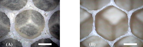 天然蜂窝中单个蜂窝孔的几何构型:(A)建造过程中的蜂窝孔;(B)建造好的蜂窝孔,比例尺为2mm。
