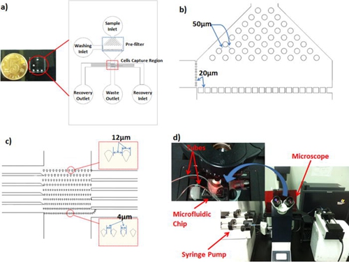 该研究开发出一种新型微流控芯片,可以快速有效地从癌症病人血液中实时分离和捕捉循环肿瘤细胞(CTCs),在癌症筛检及治疗评估中都有较大的潜在应用价值。面对现有CTCs检测装置的一些问题,如CTCs捕获率较低,临床应用的可行性低等,该系统有针对性地提高了CTCs的捕获率(>90%),并成功实现了肝癌病人临床血液样本中CTCs的数量检测。其实现原理为利用CTCs与血细胞的细胞尺寸以及硬度的差异特点,将血液通过经过特殊设计的微柱阵列,筛选血液中的CTCs。