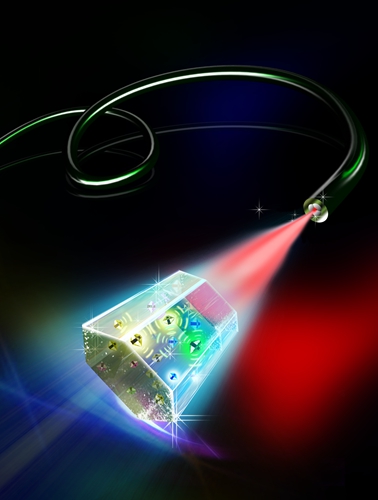 针对这一瓶颈问题,本文首次发现用较高的激发光能量密度可以解决荧光淬灭的限制,从而实现了高浓度掺杂的上转换纳米粒子。利用高掺杂与高激发功率相结合,最终使得荧光信号强度比传统低掺杂的纳米粒子有了显著增强,使得光纤辅助下的单个纳米粒子远程探测第一次成为现实。这一新的纳米粒子的灵敏度比传统的量子点quantum dot 高了三个数量级。由于高掺杂的上转换纳米技术提供了超灵敏的光学检查手段,这一个纳米粒子被命名为SuperDotTM。 这一成果大大推动了上转换纳米技术在红外探测,生物标识、医学成像,高通量单细胞检测,防伪技术等领域的应用。