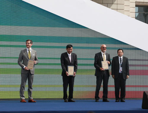 大赛的举办得到了许多企业的大力支持和帮助,为了表示对赞助商的感谢,张东晓">张东晓向发起赞助商应用材料、天威、施耐德的公司代表授牌。