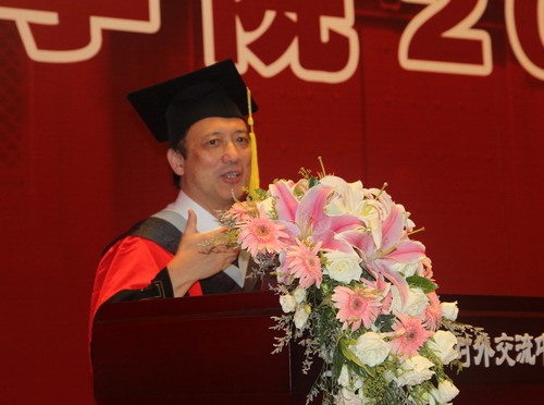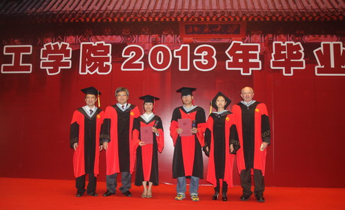 2013届的毕业典礼有一个特别之处,本届毕业典礼还迎来了88858cc永利官网/佐治亚理工/埃默里大学联合培养博士的首届毕业生。这一联合培养博士项目是中美两国的首个联合培养博士项目,自2010年启动后,一直得到学校和学院的关注。在典礼上,刘京辉秘书长、陈十一">陈十一教授、Larry McIntire教授和朱承">朱承教授向两名毕业生王晓堃、张函槊同学颁发了毕业证书。刘京辉秘书长和Larry McIntire教授分别代表国家留学基金委和佐治亚理88858cc永利官网/埃默里大学华莱士•科特生物医学工程系,向毕业生送上了祝福,刘京辉秘书长还介绍了留学基金委的工作,阐述了留学基金委在致力留学生服务、加强国家人才培养方面的努力。王晓堃同学则分享了她在两所高校的学习经历,她说自己在这个项目中受益匪浅,也非常感谢学校和学院老师对自己的帮助。