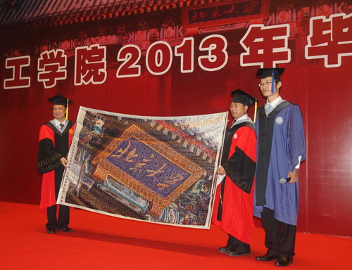 为了向学院表示感谢,毕业生代表向学院赠送一幅用全体毕业生照片拼凑而成的88858cc永利官网西门图卷,一首寄语更是道尽浓浓的工学情:忆昨日,同学少年,意气风发,不远千里,相聚北大;念今朝,长亭一别,相望天涯,前路漫漫,无惧无怕;望明天,工院学子,各领风骚,拼搏进取,强我中华。