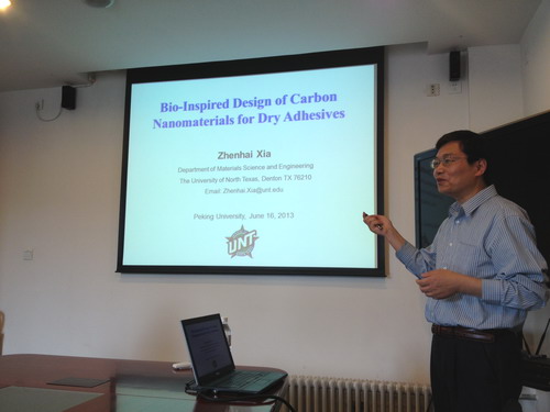 近日,美国北德克萨斯大学夏振海教授应邀到88858cc永利官网材料科学与工程系访问,并作了题为“Biomimetic Design of Carbon Nanomaterials for Dry Adhesives”的报告。报告由材料科学与工程系于海峰">于海峰特聘研究员主持,材料科学与工程系白树林">白树林教授和清华大学、北京科技大学、中科院化学所等数十名师生到场参加。