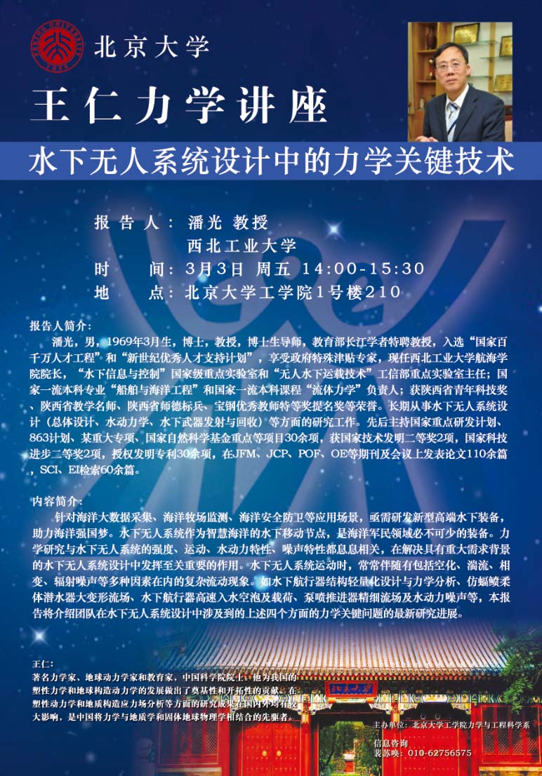 王仁力学讲座【3月3日】:水下无人系统设计中的力学关键技术
