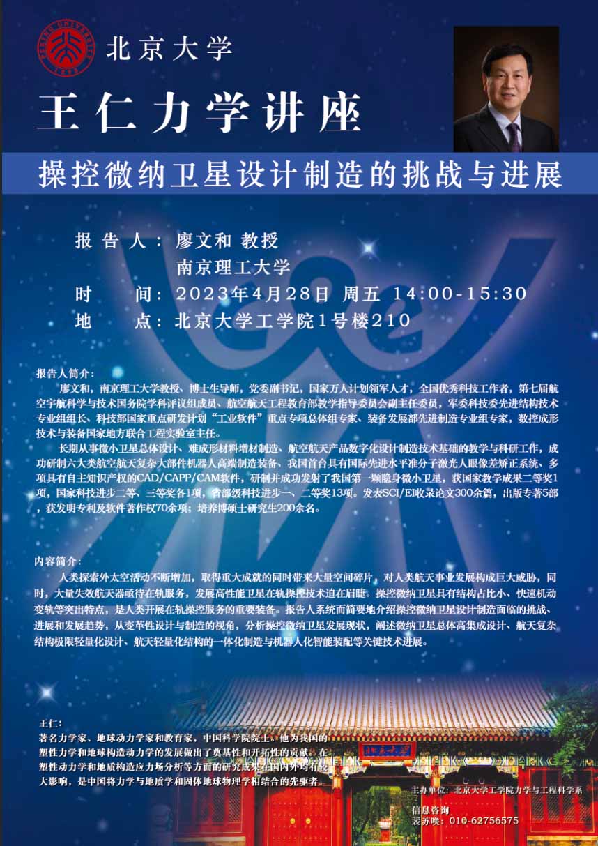 王仁力学讲座【4月28日】:操控微纳卫星设计制造的挑战与进展