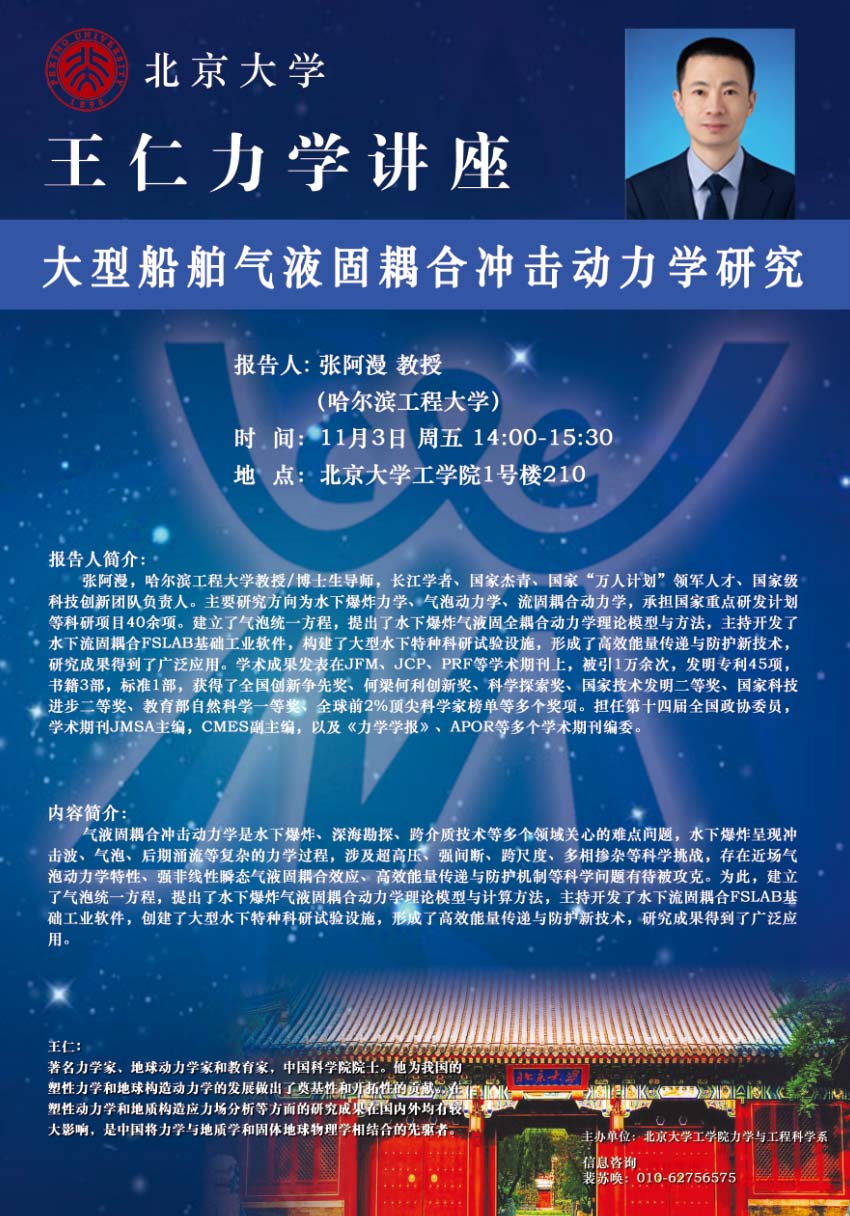 王仁力学讲座【11月3日张阿漫】:大型船舶气液固耦合冲击动力学研究