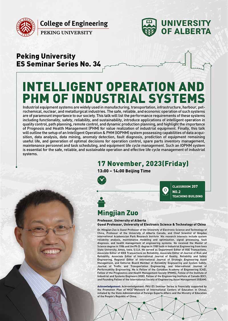 工程科学国际讲堂【11.17 Mingjian Zuo】:INTELLIGENT OPERATION AND PHM OF INDUSTRIAL SYSTEMS
