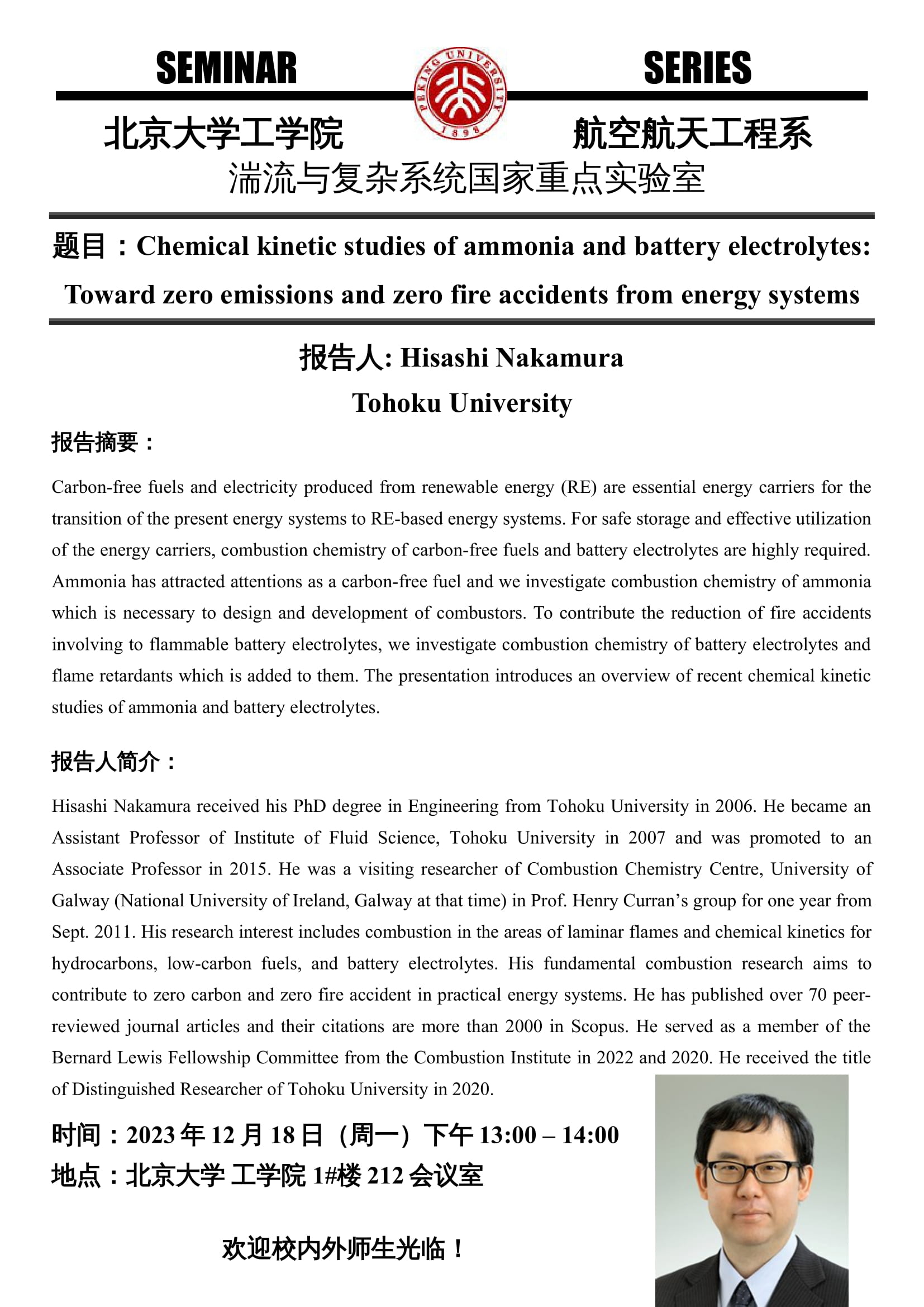 航空系学术报告【12.18 Hisashi Nakamura】:Chemical kinetic studies of ammonia and battery electrolytes: Toward zero emissions and zero fire accidents from energy systems