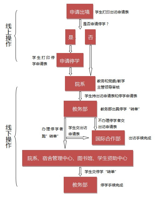校本部本科生参加出境交流项目(含港澳台)需办理出访申报手续,出境时间为一学期或一学年的,出行前还需办理停学手续,返校后需办理停复手续。根据长期运行实践和学生的反馈意见,本着科学管理和精简手续的原则,经认真研究,我部决定调整手续办理流程,取消停学和停复的转单环节。学生如有相关的未了结业务,请自行去相关部门办理手续,包括办理宿舍相关手续、归还学校和学院图书馆的影音图书资料、有助学贷款的去资助中心结算贷款,留学生还需要去留学生办公室办理相关手续。具体流程变化如下: