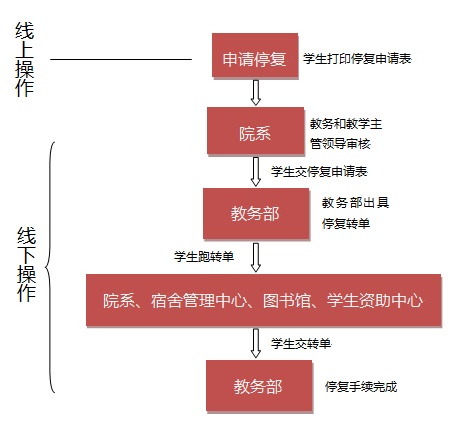 以上手续的具体操作指南,请见教务部网站—学籍异动—异动办理流程里的“出境手续办理流程”、“停学手续办理流程”和“停复手续办理流程”。